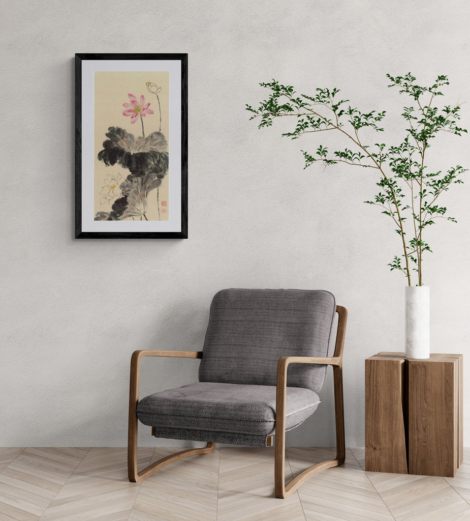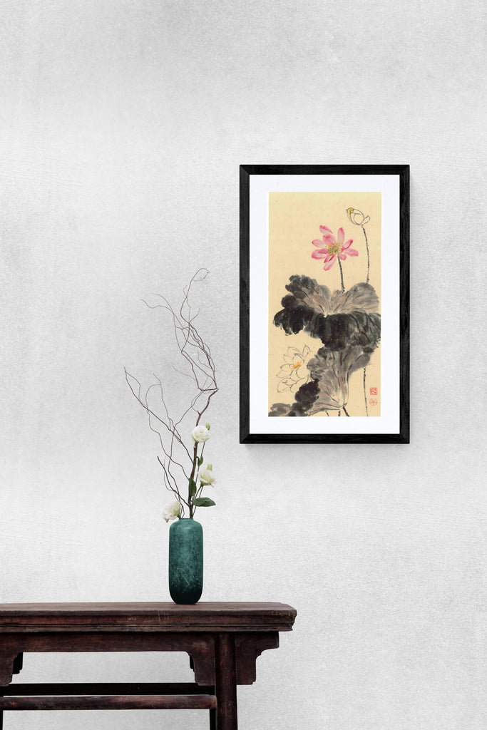 Subdued shades truly set this artwork apart. Symbolically, the lotus denotes purity, fortitude, and regeneration in Chinese lore.