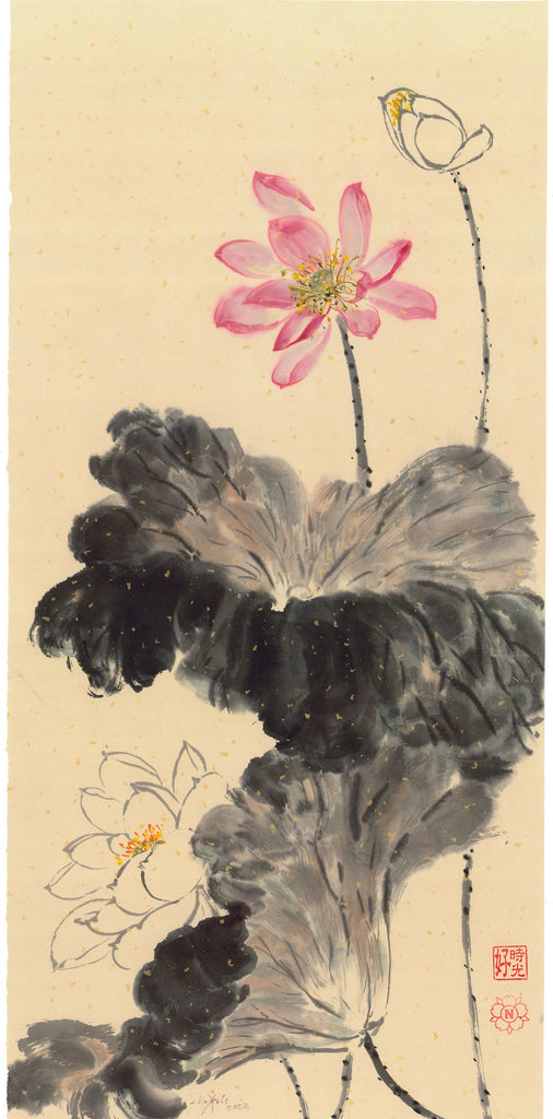 Painted with traditional brushes and watercolour on dyed Xuan paper with gold flecks.