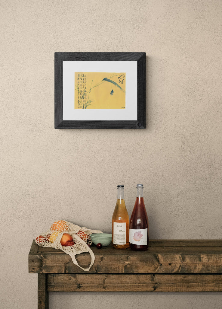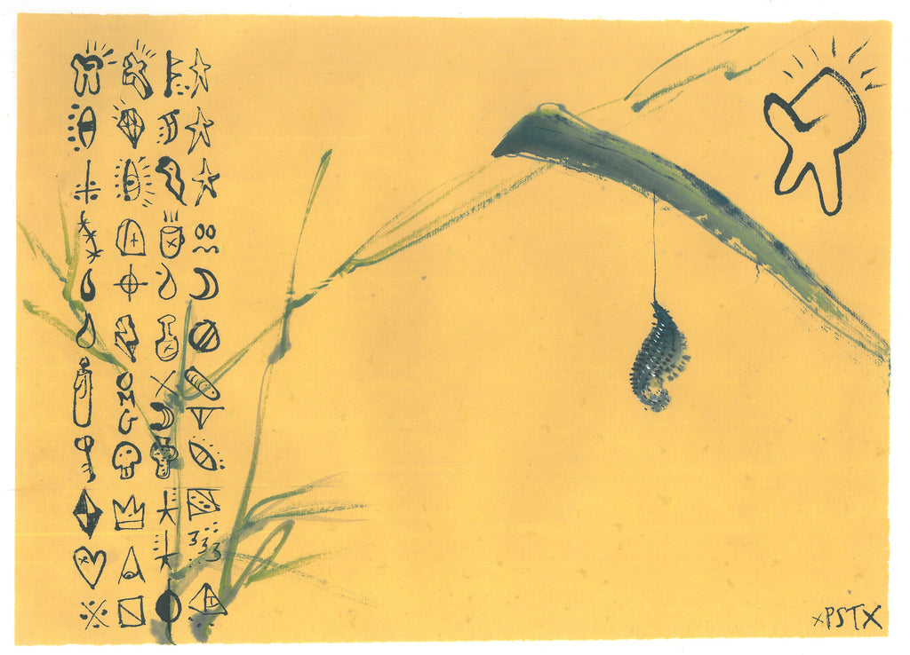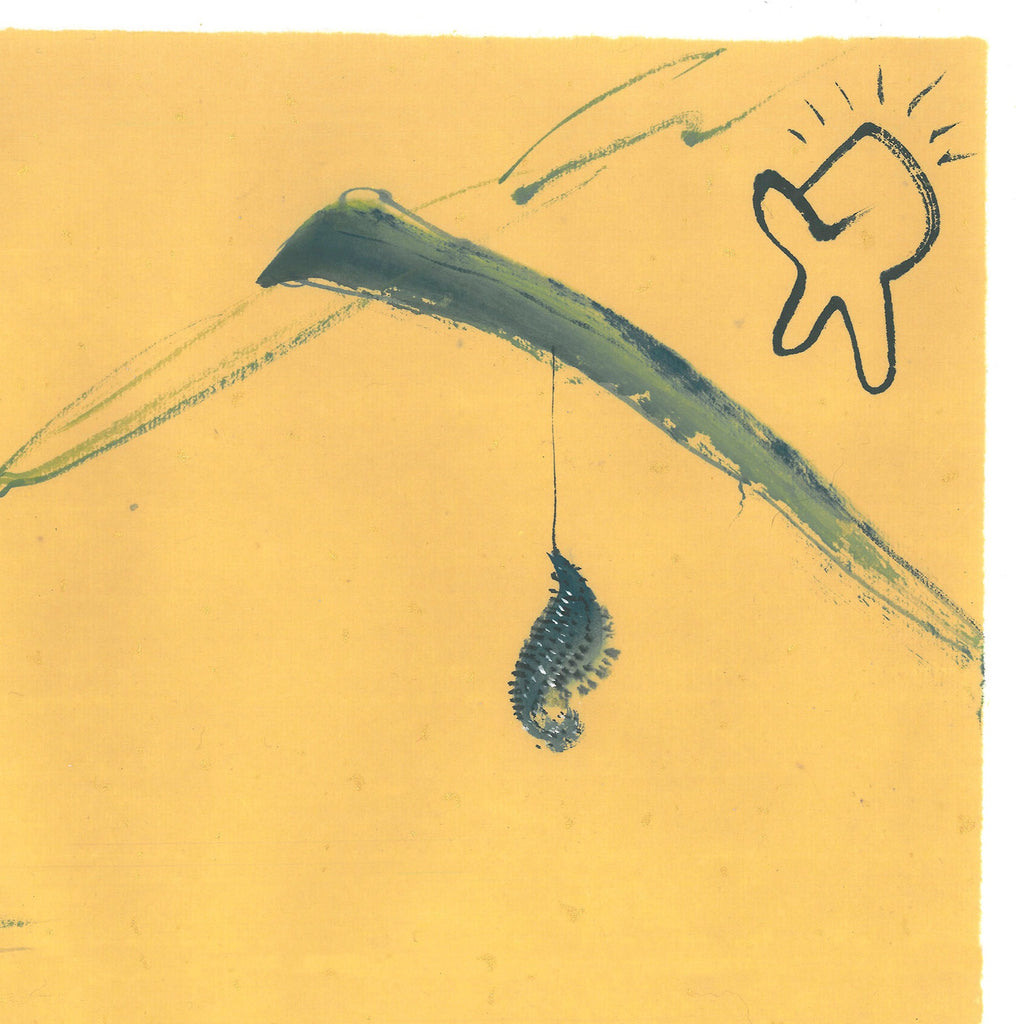 I am impressed by the collaboration between Nikole and Tim from Prisonstyle Tattoo. The artwork's simplicity is striking and Tim's doodles along the painting's side resemble a Japanese woodblock print with a poem. It's fascinating to imagine what the doodles might be conveying about the chrysalis clinging to the leaf. The artwork is now mounted and ready to be posted. However, please note that it is handmade, so there may be imperfections and the edges might appear rough. Once framed, the artwork will look amazing.