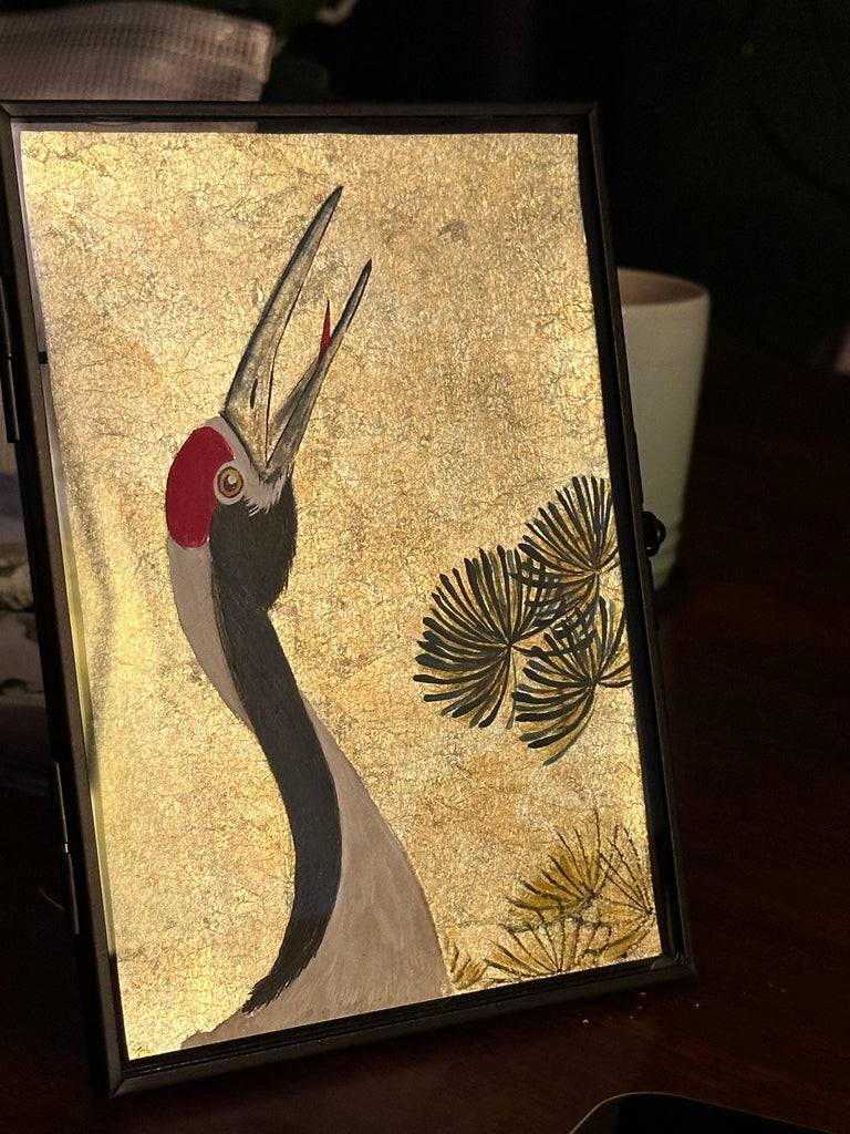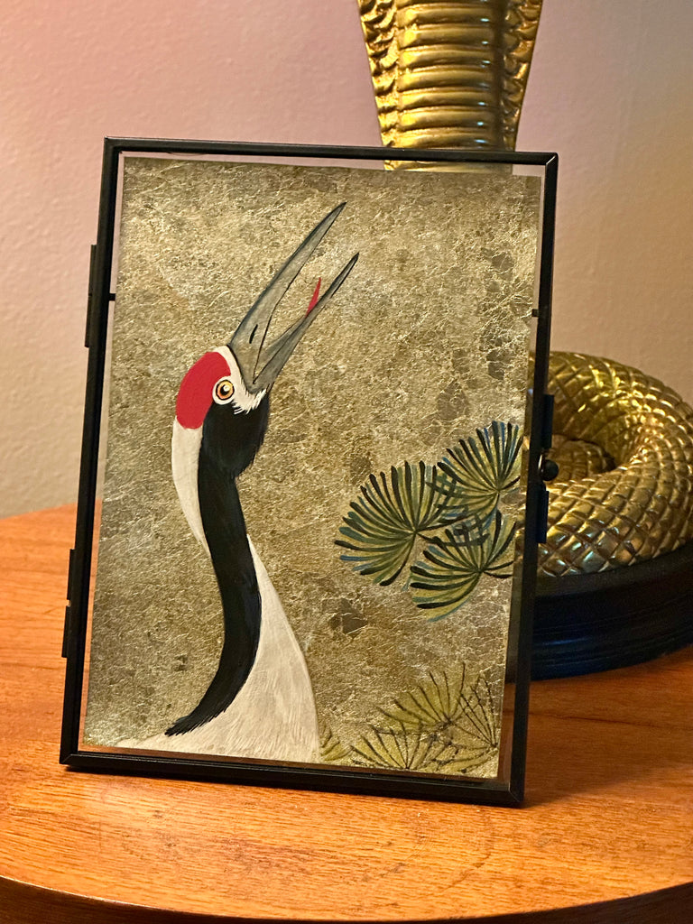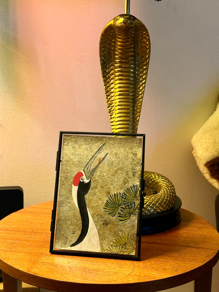 Nikole Lowe's crane's head on gold leaf is a triumph of artistry! The regal elegance of the crane comes to life, gracefully captured on a backdrop of luxurious gold leaf. Housed in a sleek black metal frame, this masterpiece from Good Times Tattoo in Hackney Central exudes sophistication. Nikole's skillful touch transforms every detail into a captivating visual experience. A true testament to her talent and a striking addition to any art collection. Unveil the allure of nature in this exquisite creation!