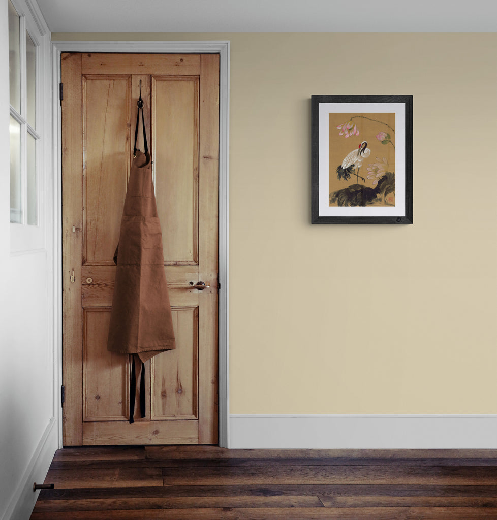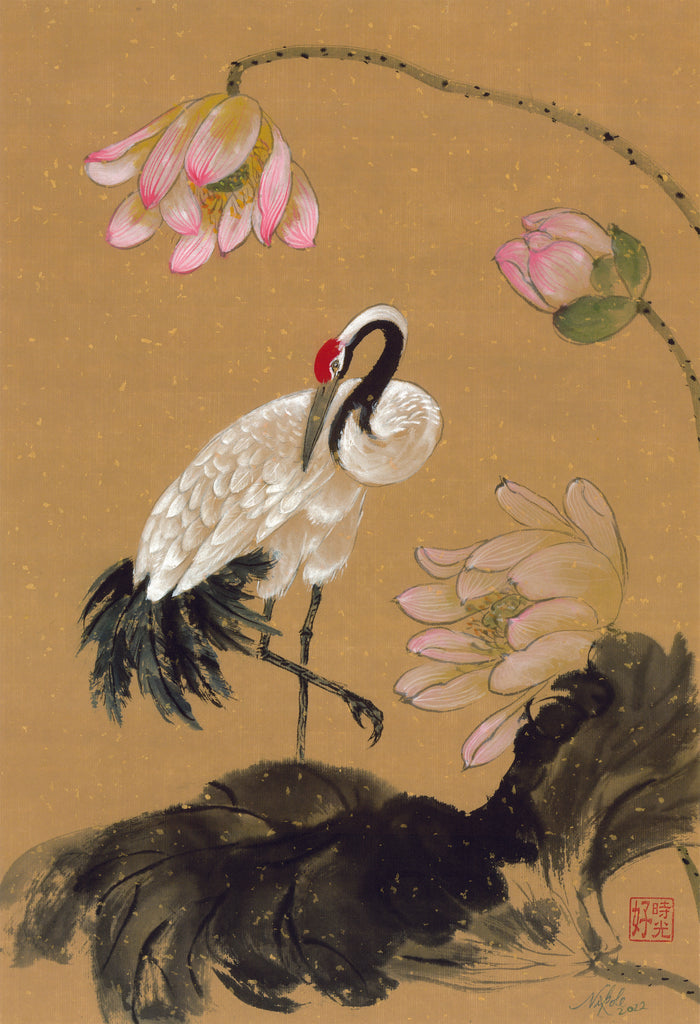Cranes symbolizing longevity and the lotus representing strength and purity give this painting a powerful visual. It is a stunning work of art that will be a beautiful addition to any wall.