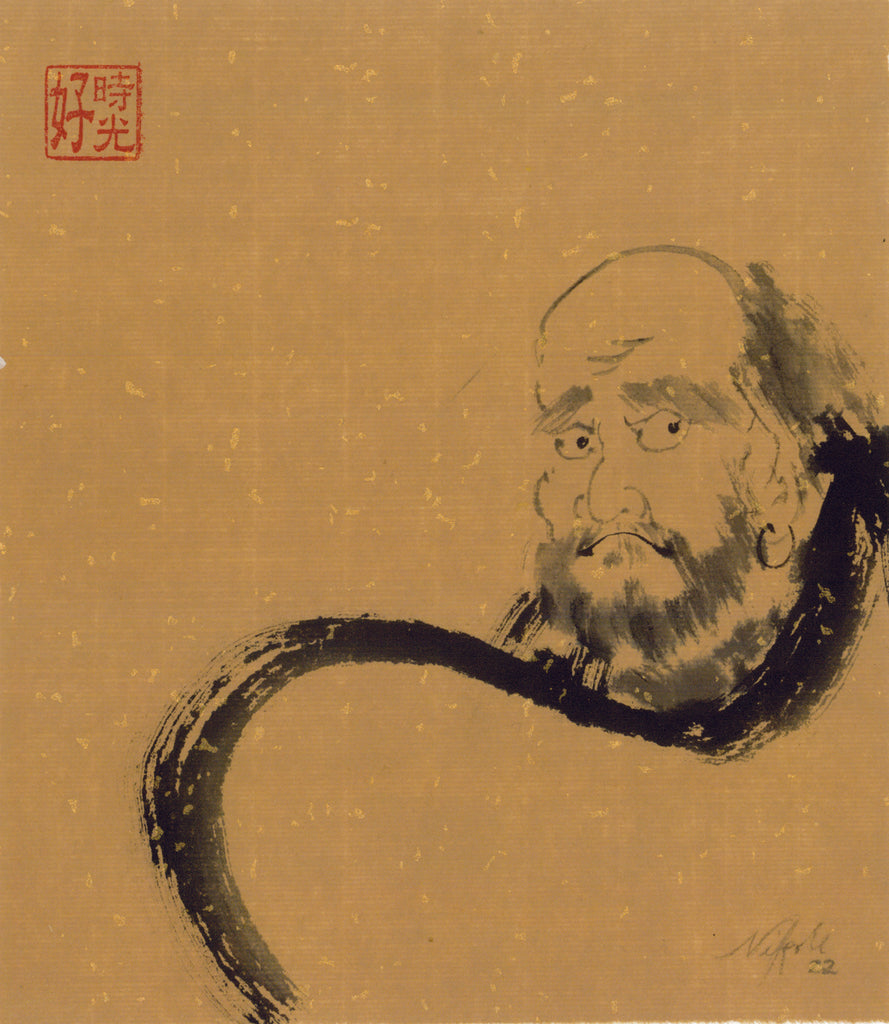 Painted with traditional brushes and watercolour on dyed Xuan paper with gold flecks.