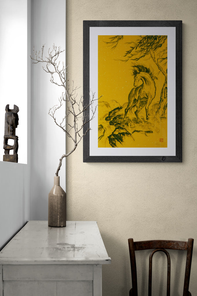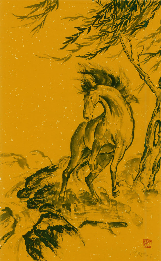 Nikole explains that the inspiration behind her painting was to depict a horse enjoying itself and getting playful on a windy day, just like the horses she had when she was younger. The way she has captured the essence of that moment, particularly with the wind rustling through the weeping willows, is truly impressive. This stunning artwork is an original Chinese piece by Nikole Lowe, painted on dyed xuan paper - a fragile rice-based paper with gold flecks.