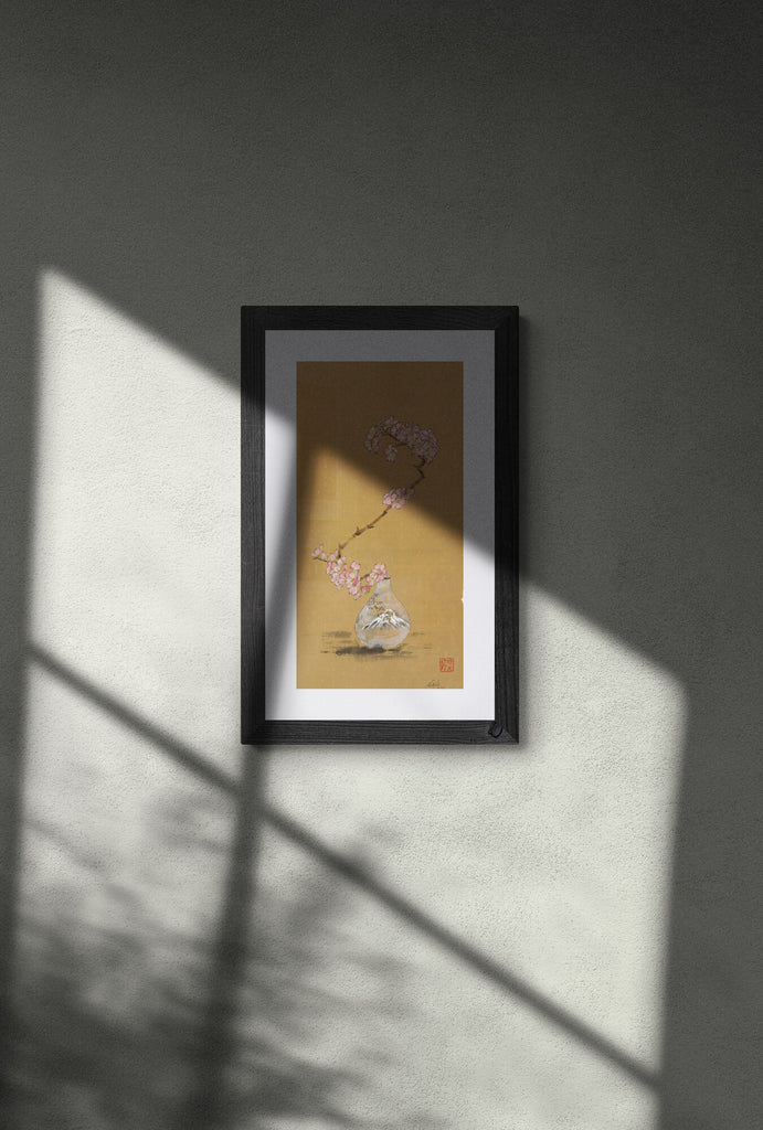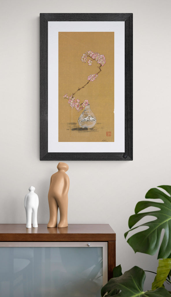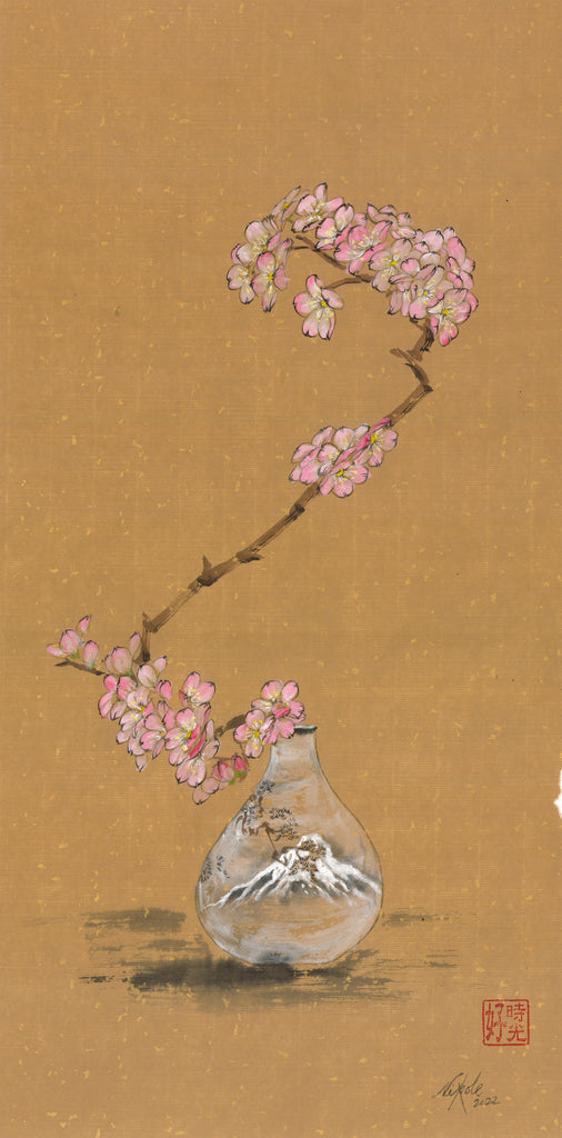Ikebana is a Japanese art form that focuses on flower arrangement. Its name translates to "arranging flowers" or "making flowers come alive." The arrangements are typically elegant and simple, much like the beautiful painting depicted here. The image features cherry blossoms in a vase with Mount Fuji in the background, painted using traditional brushes and watercolour on dyed Xuan paper with gold flecks., painted using traditional brushes and watercolour on dyed Xuan paper with gold flecks.