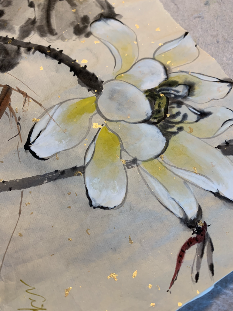 A small Chinese spontaneous painting of a lotus and a lone dragon fly perching on a petal.