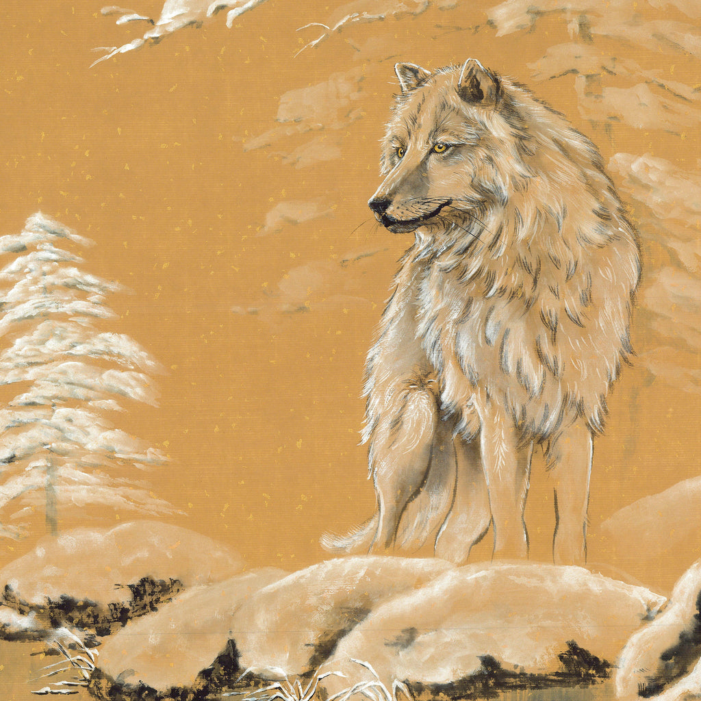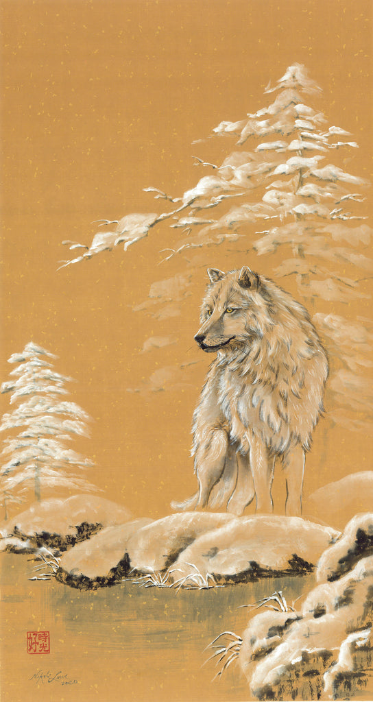 Painted with traditional brushes and ink on dyed Xuan paper with gold flecks.