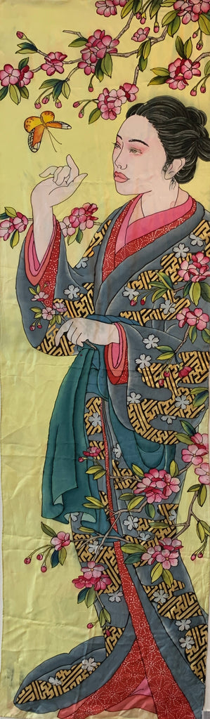 This exquisite silk scarf designed by Nikole is a testament to her artistic talent. The captivating geisha and butterfly painting on a bright yellow backdrop radiates energy and warmth. The intricate details on the geisha's kimono and the blossom branch add to the scarf's artistic appeal, making it a true masterpiece. It's not just a fashion accessory but a work of art that you can proudly own and showcase in your collection. Bring home a touch of Nikole's artistry with this stunning silk scarf.