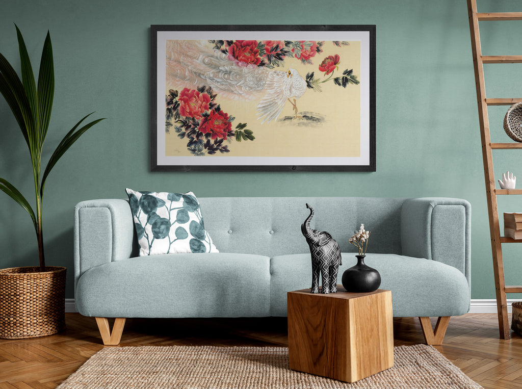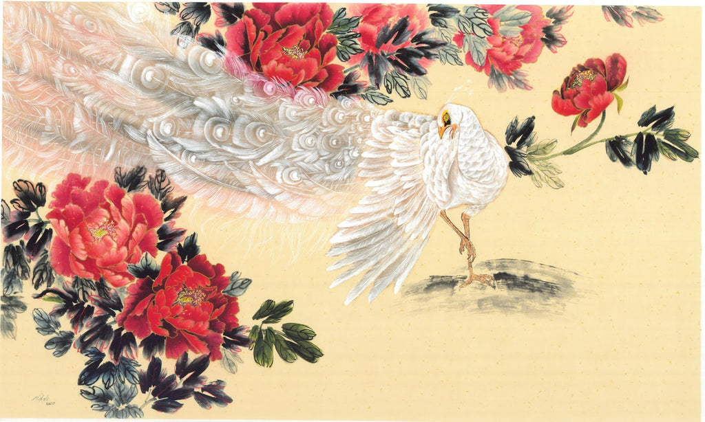 This is one amazing painting, the delicate lines that make up the peacocks tail are enough to draw you in for hours, let alone the soft flowers you can almost smell.