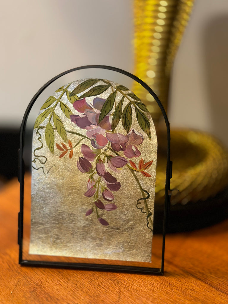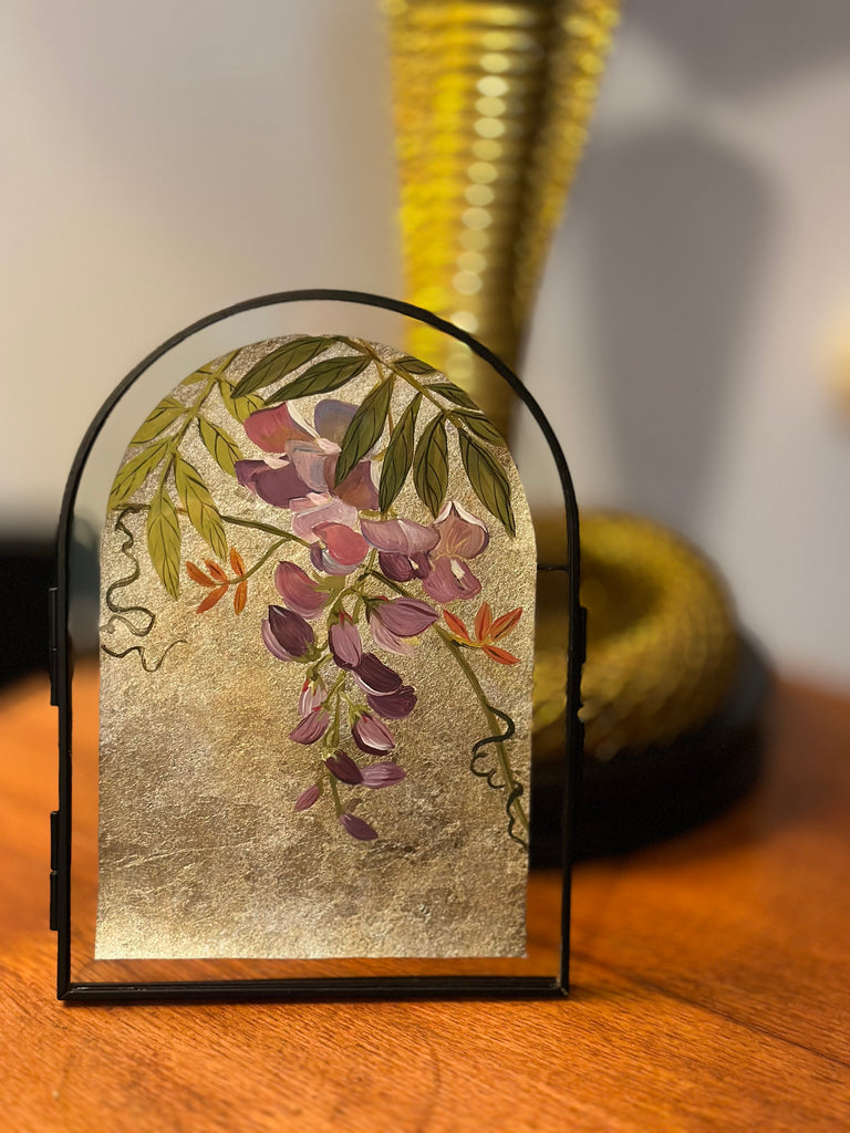 Dive into the mesmerizing world of Nikole Lowe's artistic vision with this stunning acrylic painting on gold leaf. Picture the cascading beauty of wisteria in enchanting shades of purple, gracefully descending from the top of the frame, creating a visual symphony of nature's elegance.