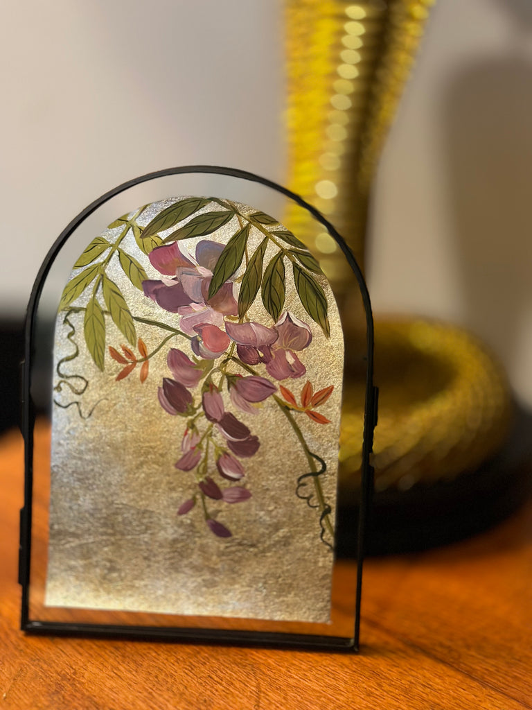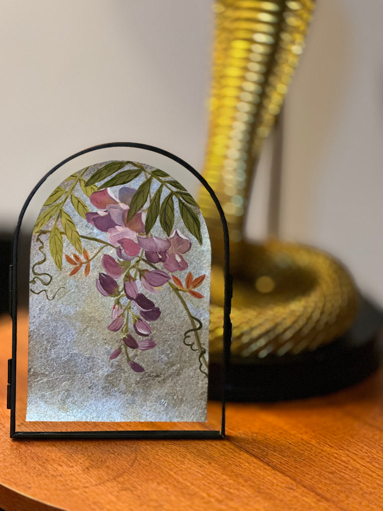 Housed in a unique arch glass frame and adorned with a sleek black metal edge, this masterpiece captures the essence of blooming wisteria and adds a touch of modern sophistication to any space. Elevate your surroundings with the magical touch of Good Times Tattoo's creativity, and let Nikole Lowe's artistry blossom in your home. Don't miss the chance to bring this exquisite piece into your life and embrace the beauty of nature at every glance!